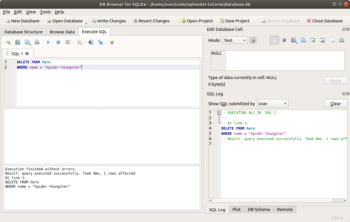 INFO Engine DELETE FROM hero WHERE hero.id = ? INFO Engine [generated in 0.00020s] (2,) INFO Engine COMMIT -